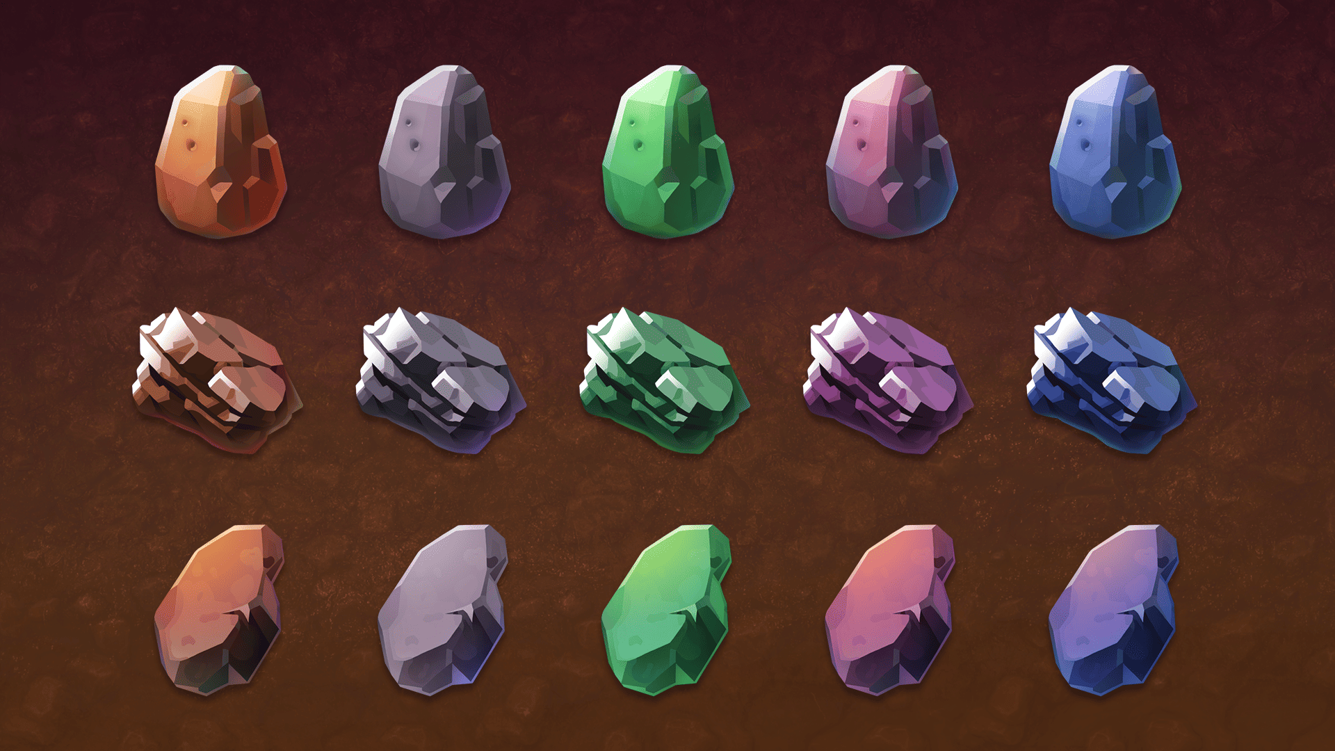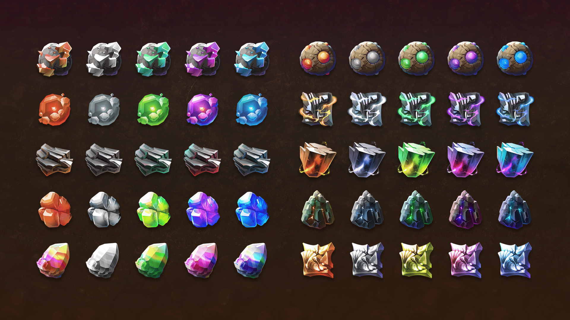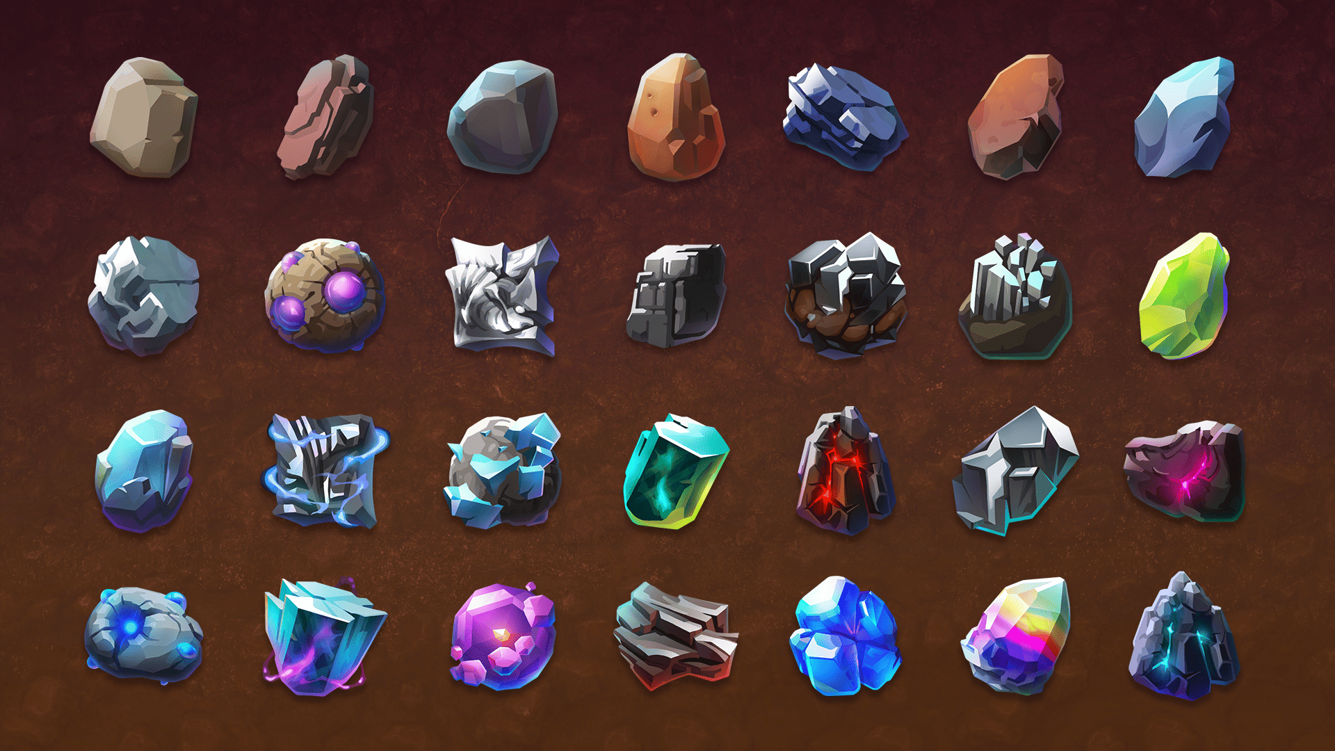 A set of 150 fantasy ore icons. Includes 30 designs in 5 different colors, provided in 128/256/512 PNG resolutions with a preview scene included.