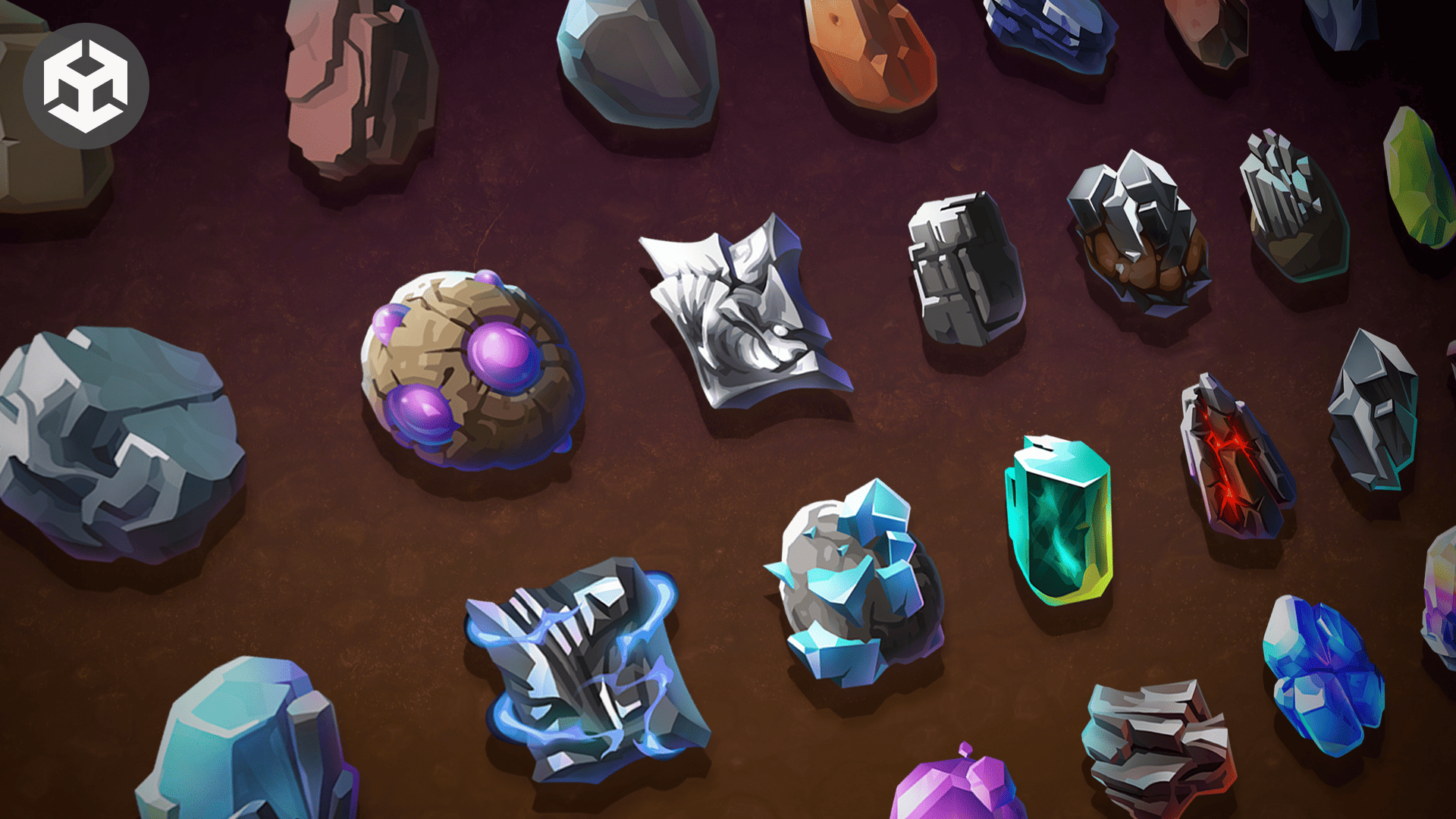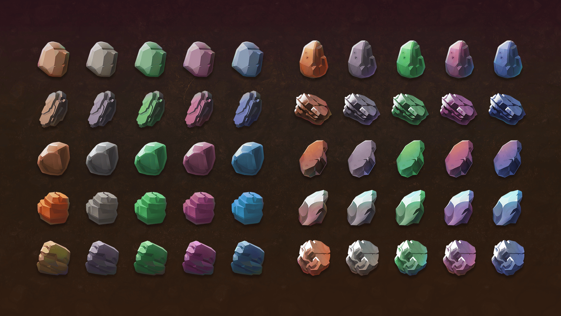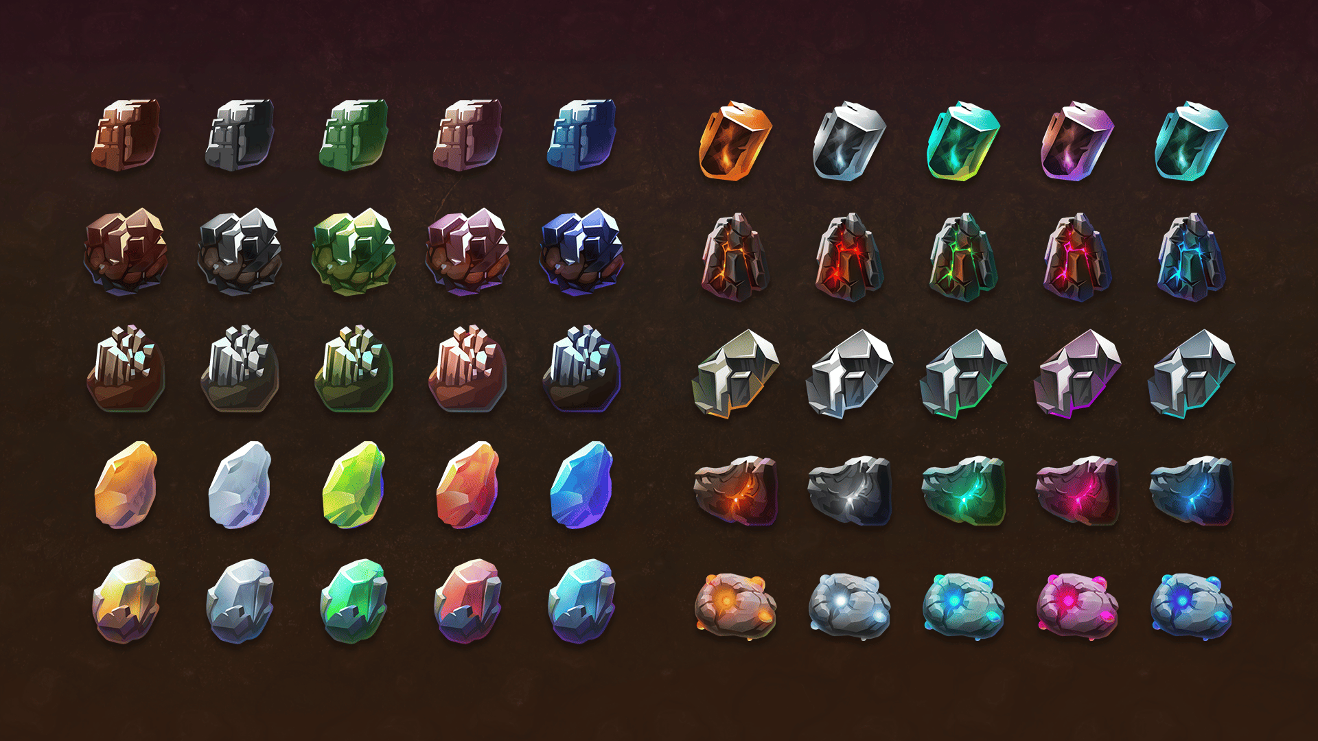 A set of 150 fantasy ore icons. Includes 30 designs in 5 different colors, provided in 128/256/512 PNG resolutions with a preview scene included.