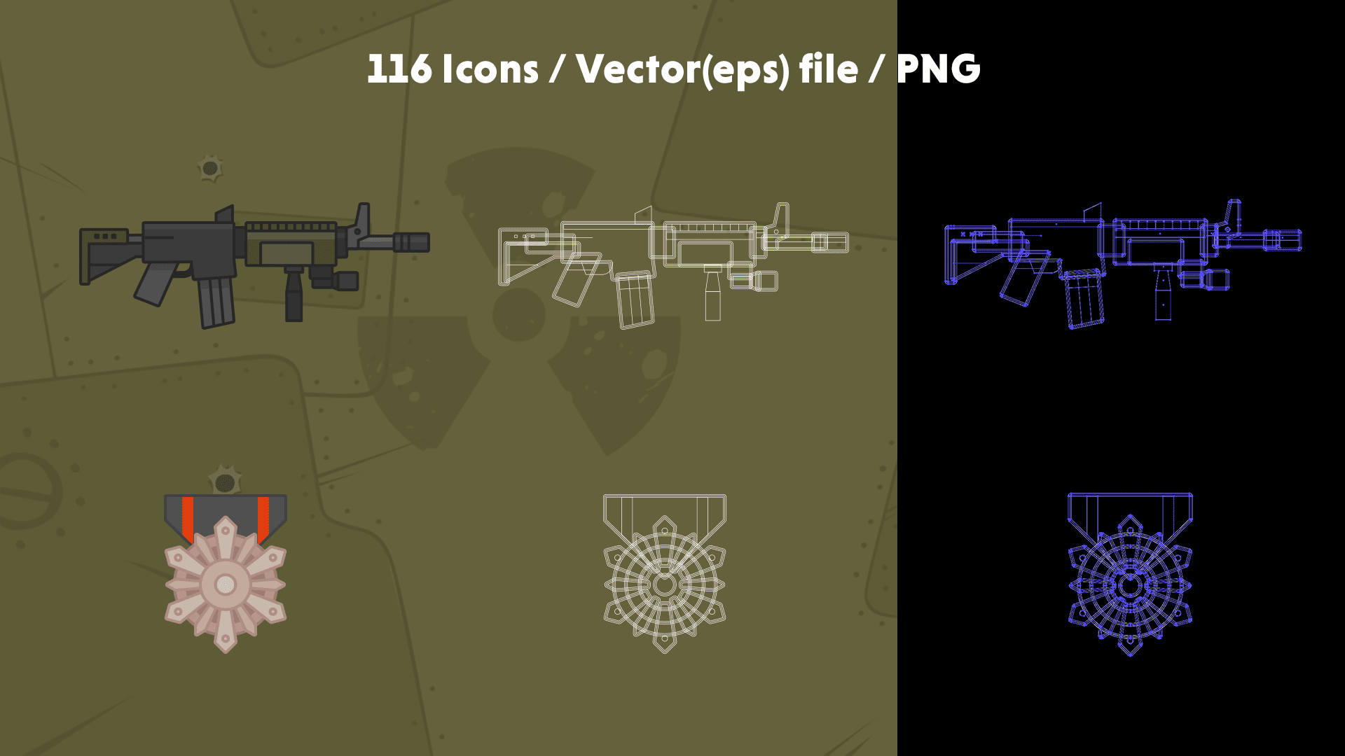 2D Icons, Military, Item, Medal, Gun, Weapon, War, Battle, Strategy, RPG, Mobile, Unity, PNG, EPS, Game UI