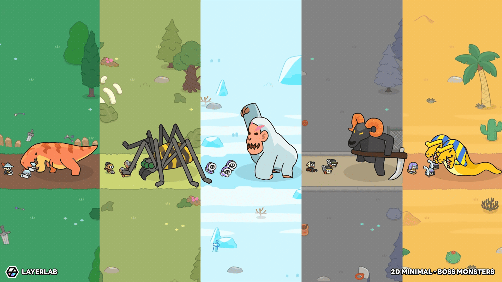A 2D Minimal Boss Monsters Pack featuring 5 unique boss characters.