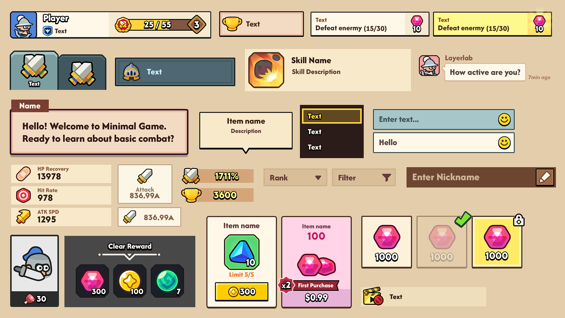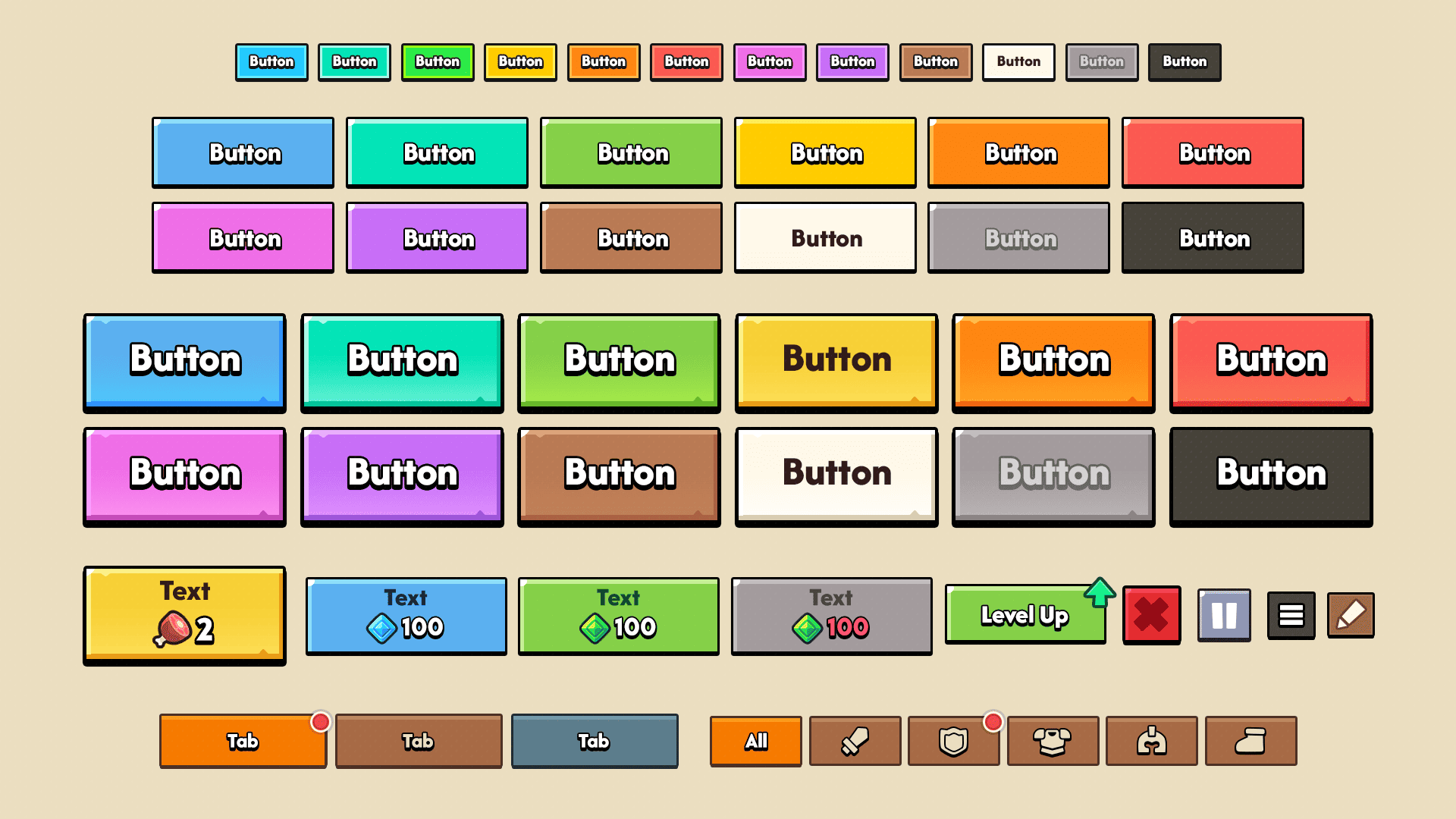 - UI structural elements: buttons, ribbons, labels, frames, sliders, panels, popups, etc.